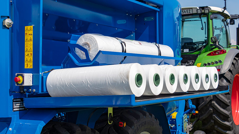 GÖWEIL revamps the design of the machine in terms of both appearance and functionality. The closed, hydraulically folding film storage has space for 14 rolls of wrapping film plus 2 rolls of wide film or netting and keeps the rolls well protected against the weather and damage.
