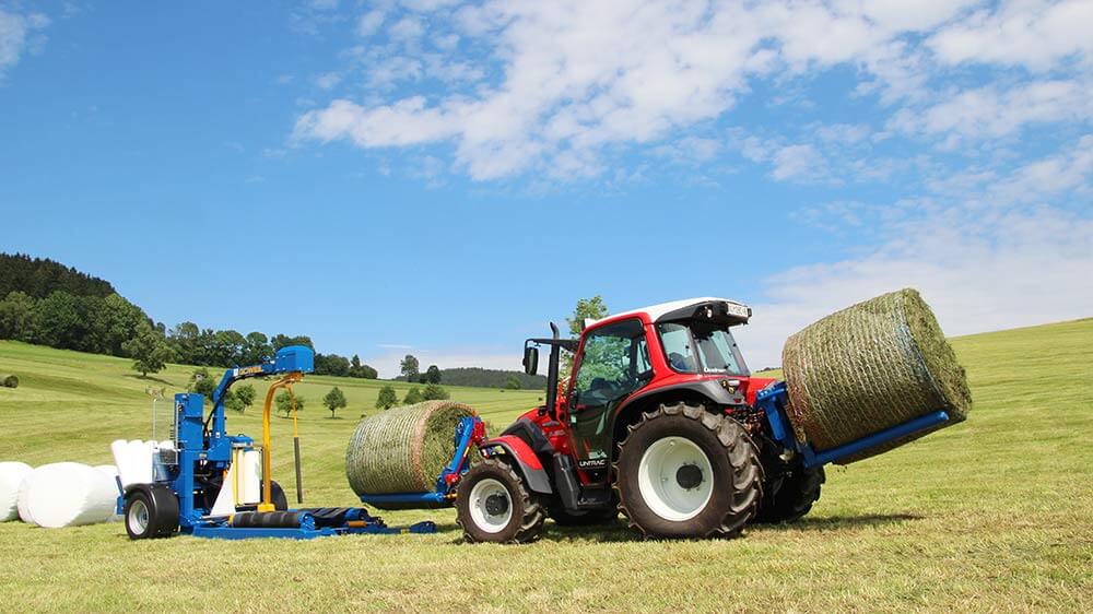 The hydraulically adjustable lift axle and the articulated drawbar make it possible to trail the wrapper and set it down at the wrapping position. Loading the wrapper using the fork attached to the three-point linkage is a breeze thanks to the low-profile design of the machine. This eliminates the need for an additional front loader.