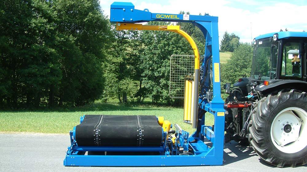 The rotating rollers arranged on both sides are connected to each other with tie rods. This produces a controlled force, which in conjuntion with the belt, generates a clamping effect on the bales. The wrapper is able to guide the bale securely even with rectangular bale dimensions. A quick adjustment can adapt the belt length to different bale dimensions.